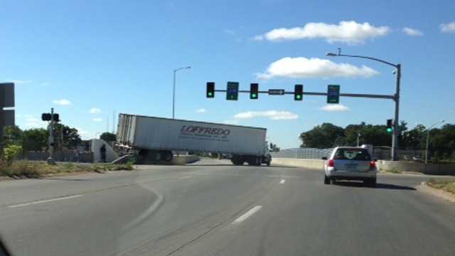 Semi Stuck On Bridge With Tires Suspended In Midair